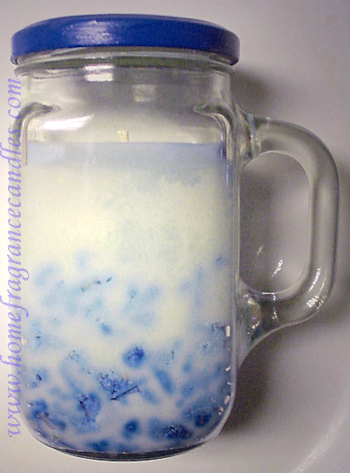 an upcycled mug style jar with a cotton fiber wick. The jar is approximately 4.5" tall.